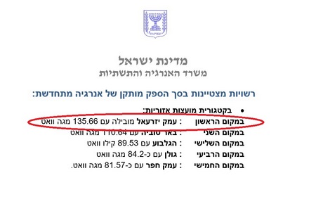 במקום הראשון: עמק יזרעאל מובילה עם 135.66 מגה ואט